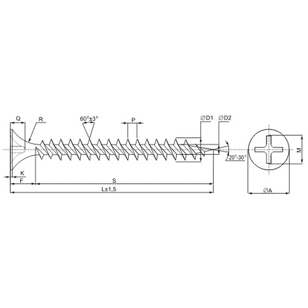 Потайная головка, крестообразный шлиц Philips  № 2, острый наконечник  с мелким шагом, оксидированные.