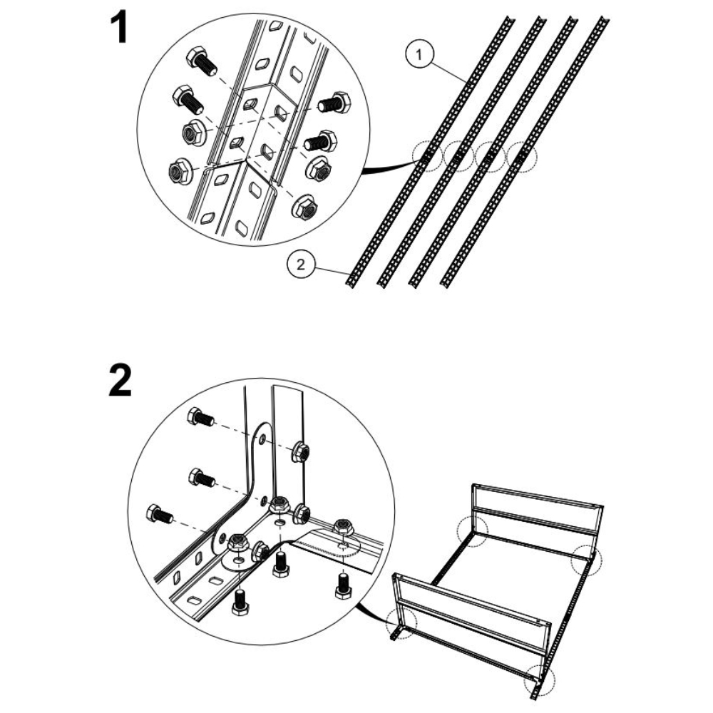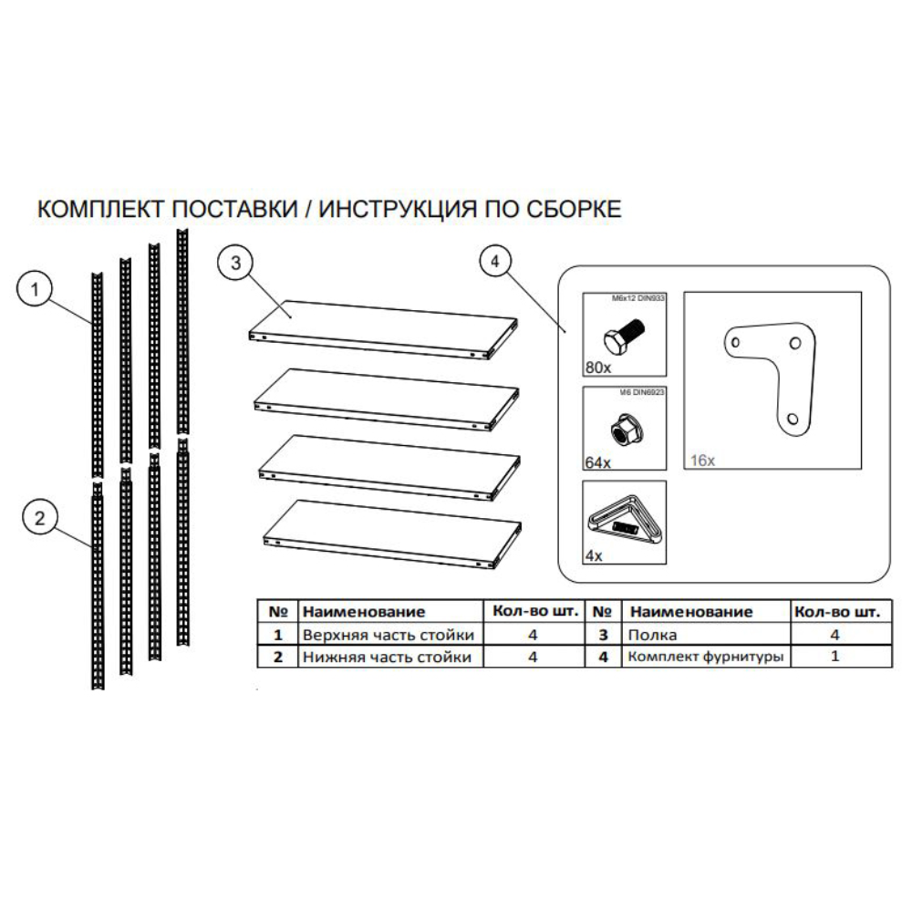 Стойки: - стойки с усиленным угловым профилем сложного сечения 30х30 мм, - разборная стойка - два вида усилителя стоек и полок: Г-образный, сборка осуществляется с использованием резьбового крепежа (болты и гайки), и Т-образный, сборка без гаек. (Комплекты стеллажей собираются при помощи болтов, без гаек).