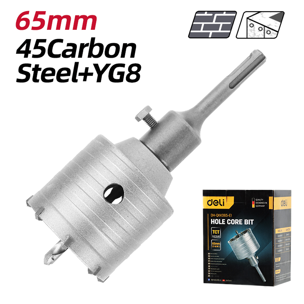 Коронка по бетону Deli YS EDH-QKK065-E1 диаметром 65 мм и длиной 220 мм предназначена для сверления отверстий в бетоне, кирпиче и камне.
