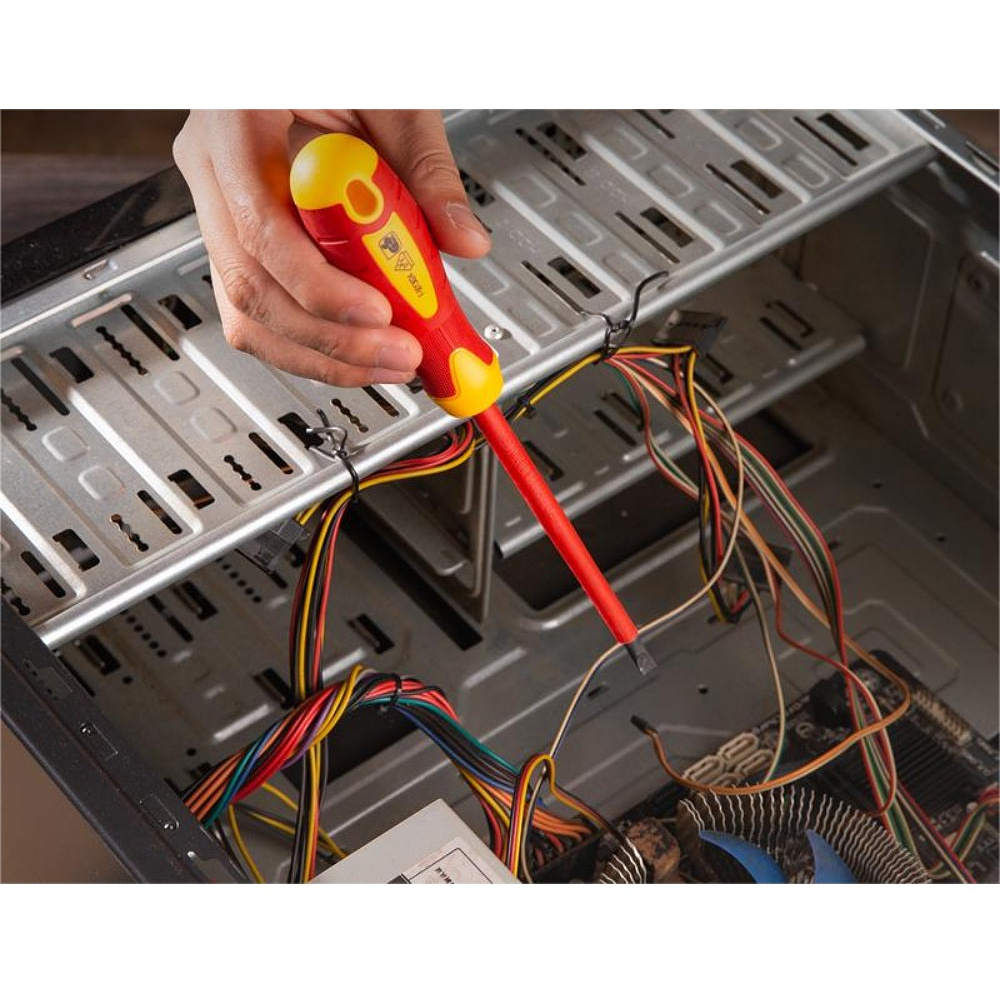 • В комплект входит четыре диэлектрические отвертки с магнитными наконечниками типа PH и SL ( SL3.0 x 0.5 x 100; SL5.5 x 1.0 x 125, PH1 х 80, PH2 х 100) и один пробник.