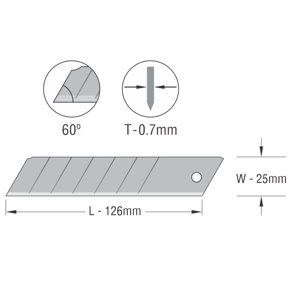 Лезвия длиной 25 мм с отламывающимися лезвиями и 7 сегментами. Двойная заточка обеспечивает точную резку. Сверх острая кромка. Равномерно закаленные лезвия для увеличения срока службы.