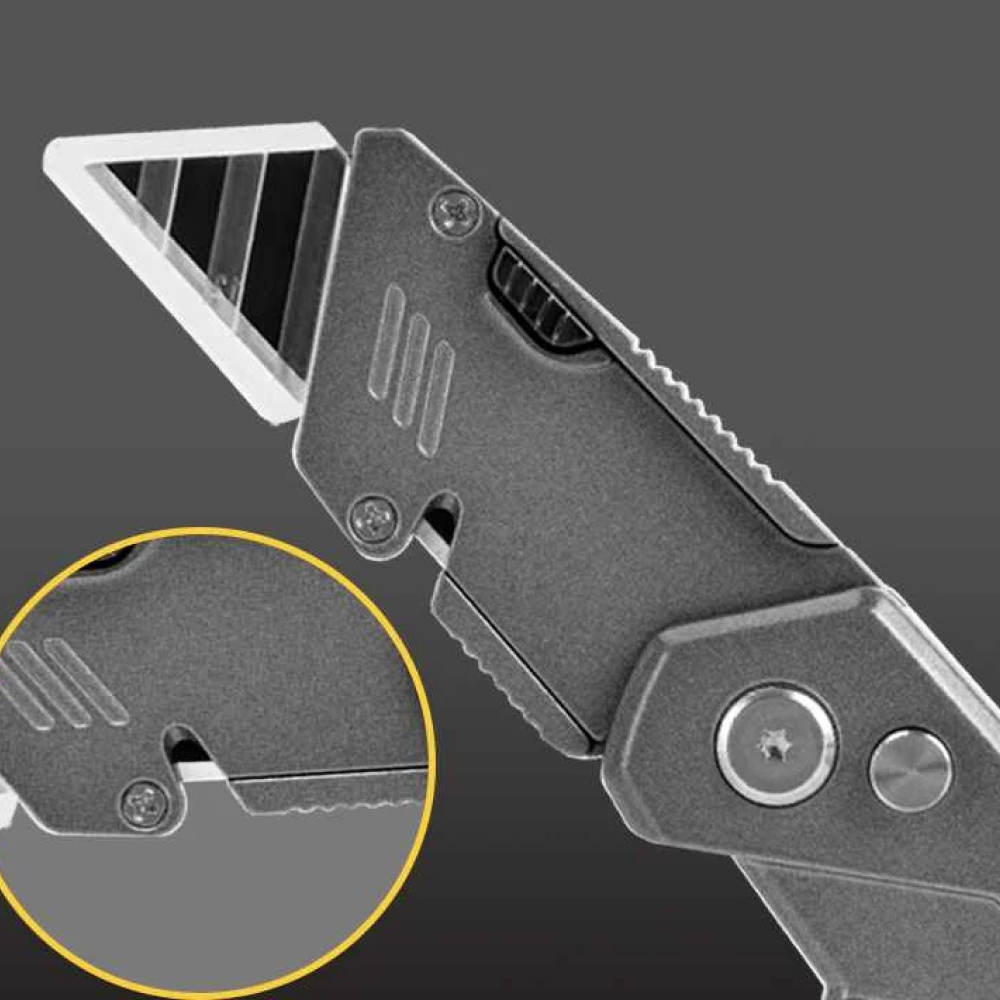 Трапециевидное лезвие изготовлено из стали марки SK2 и закрыто специальным пластиковым колпачком для защиты от случайного пореза при открывании ножа.