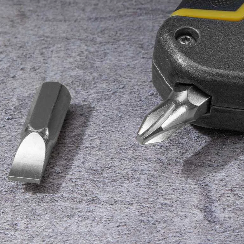 Нож можно использовать в качестве отвертки благодаря шестигранному отверстию в торце рукоятки, а внутри самой рукоятки хранятся биты PH2 и SL6.