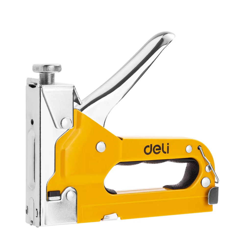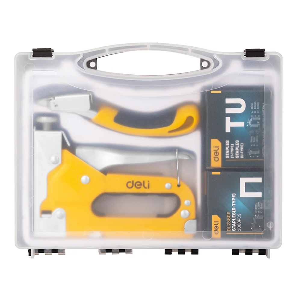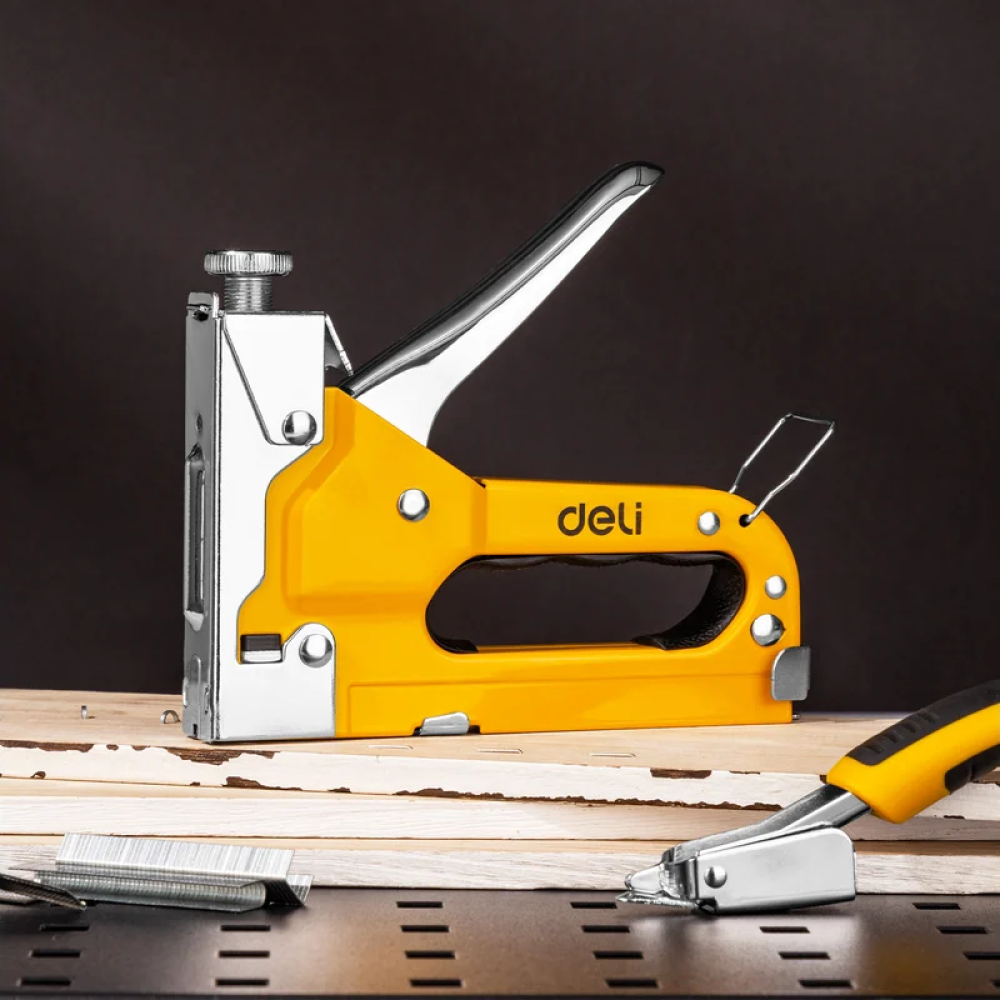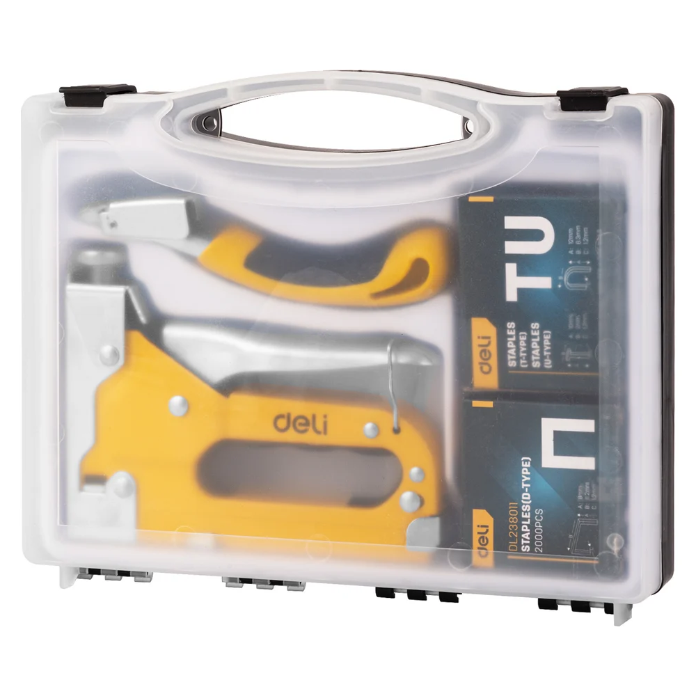 Строительный мебельный степлер DELI металлический с регулировкой + антистеплер с набором скоб в кейсе (Тип «П» 4-14 мм, «U» 10-12 мм и «T» 10-14 мм по 2000 шт каждых) - это мощный и надежный инструмент, который используется в строительстве и ремонте для крепления различных материалов, таких как дерево, ткань, пластик и многие другие.