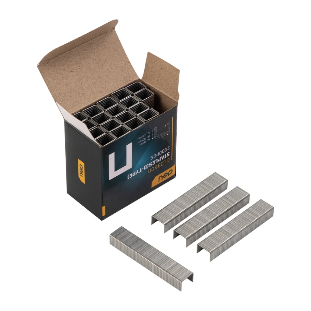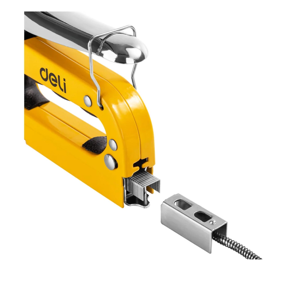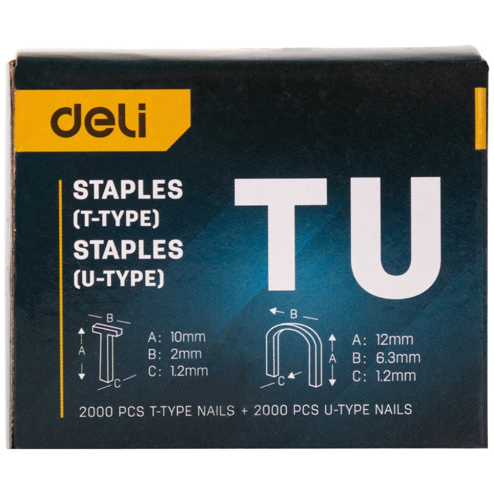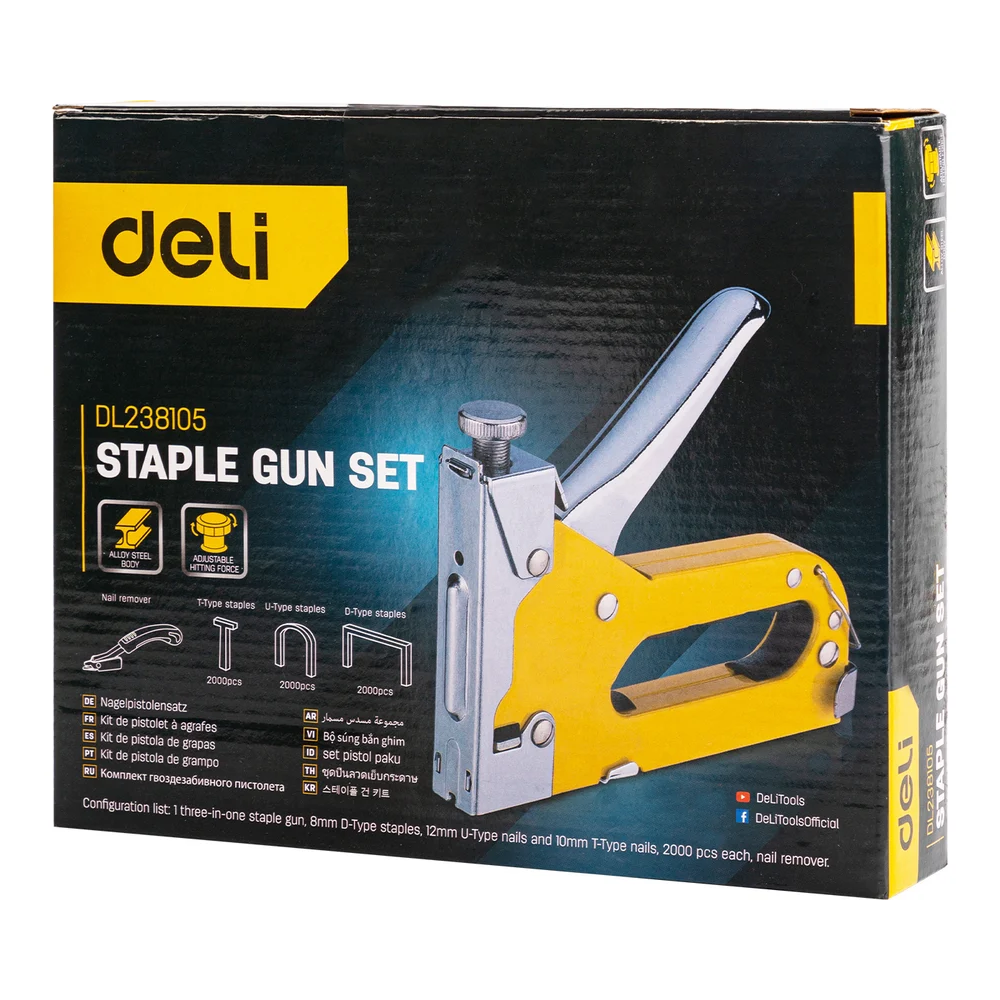 Строительный мебельный степлер DELI металлический с регулировкой + антистеплер с набором скоб в кейсе (Тип «П» 4-14 мм, «U» 10-12 мм и «T» 10-14 мм по 2000 шт каждых) - это мощный и надежный инструмент, который используется в строительстве и ремонте для крепления различных материалов, таких как дерево, ткань, пластик и многие другие.