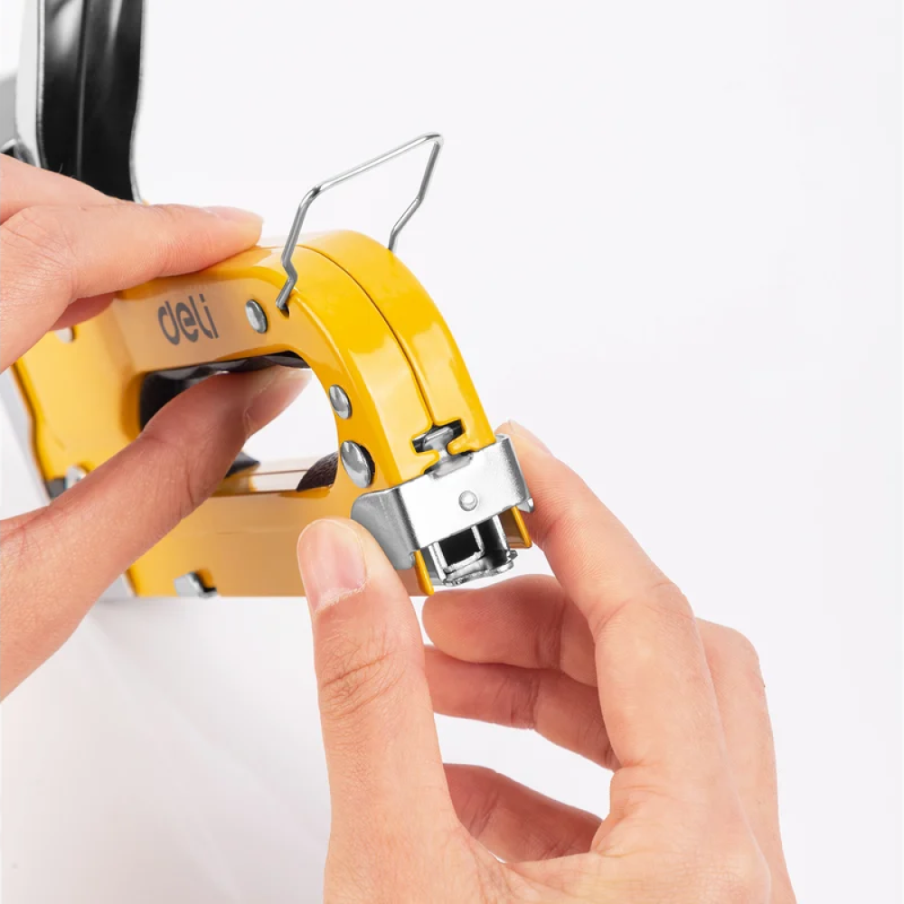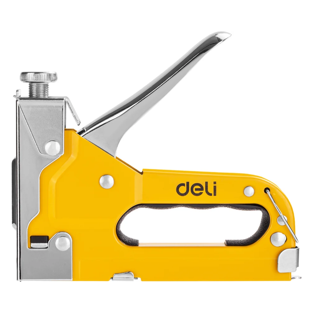 Степлер Deli DL 238105 забивает скобы механически, с помощью пружинного механизма и имеет регулируемую глубину забивки, чтобы легко подстраиваться под разную толщину материала.
