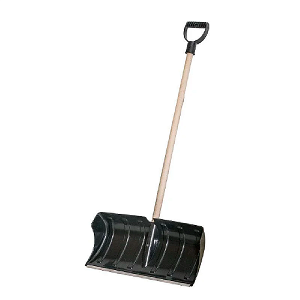 Лопата «Зима № 7 Скрепер» для уборки снега пластиковая с алюминиевой планкой, деревянным черенком (1 сорт, длина – 1000 мм, d=32 мм) и V-образной ручкой.