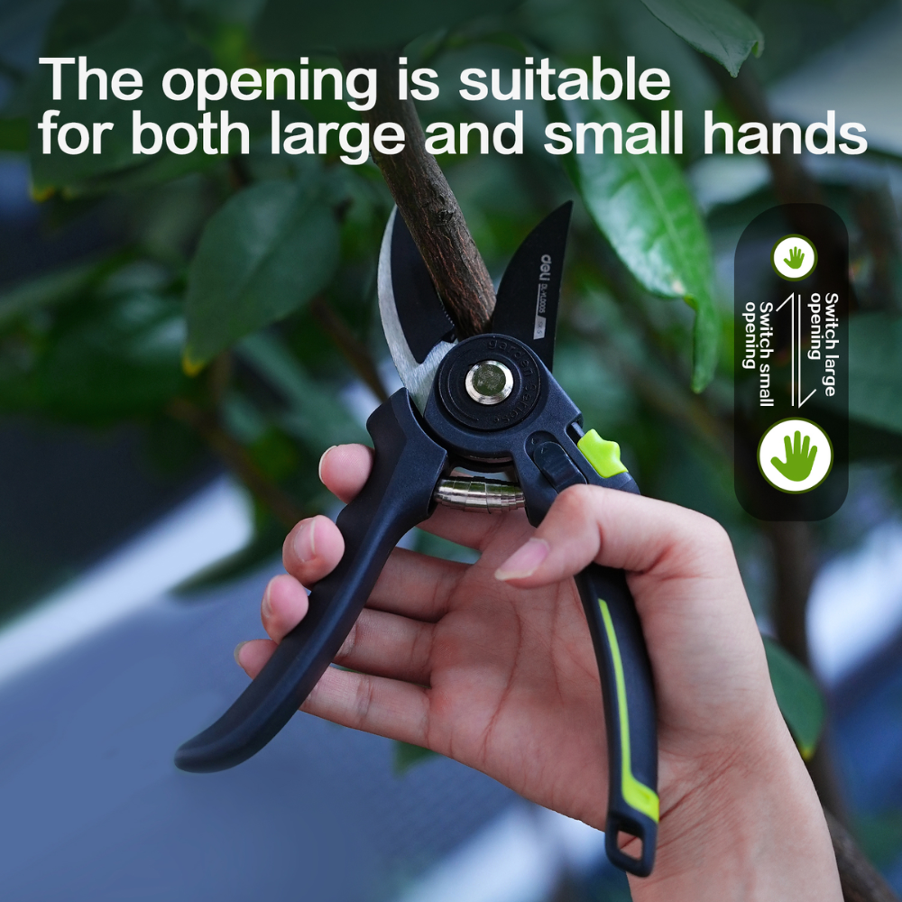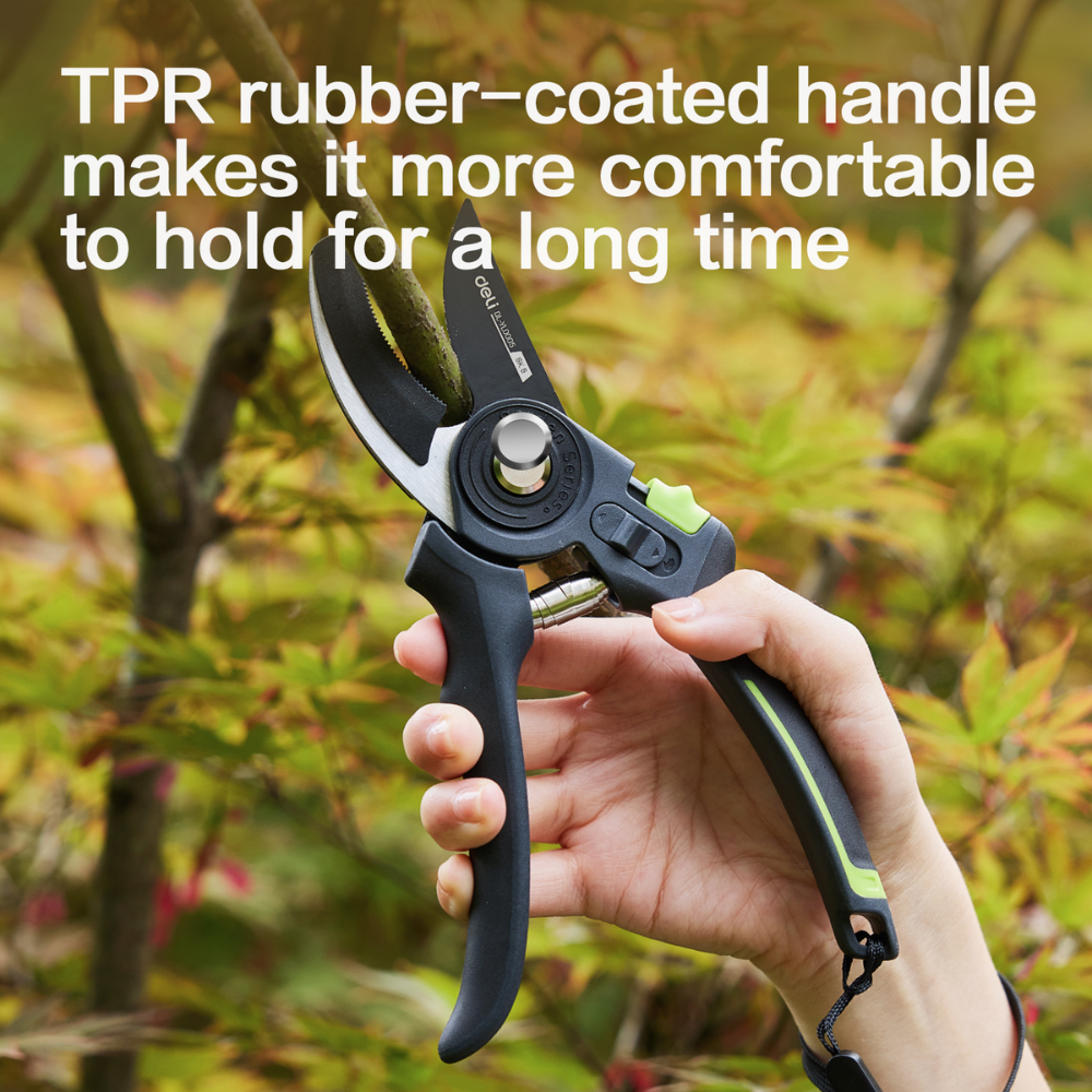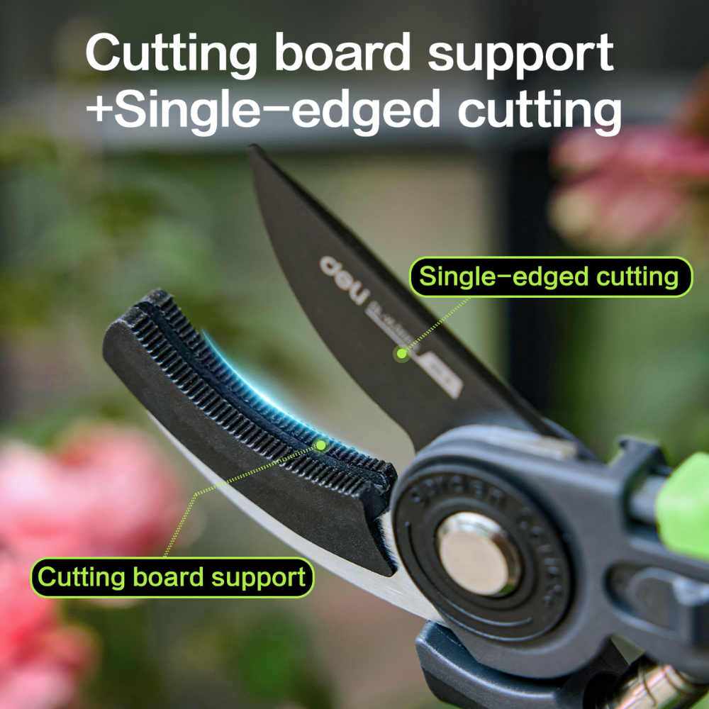 Секатор садовый Deli GS EDL-YL0005 с одним острым лезвием и упорной платформой оптимизирован для работы с сухой древесиной.